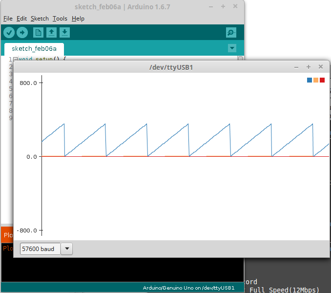Finally this device can now be used on the desktop system as if it was actually plugged into a local USB port. screen /dev/ttyUSB1 57600 works to view the serial output of this device and it can even be programmed using the Arduino environment. Below is a screenshot of the Arduino serial plotter reading remote data from the OpenWRT USB device.
